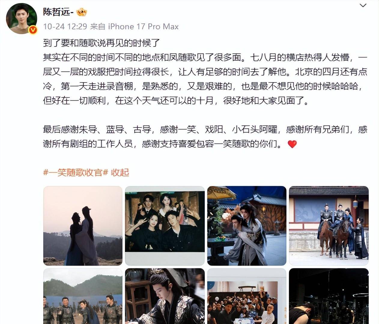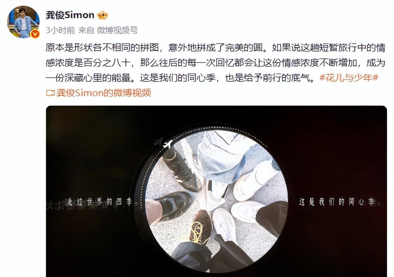 两位男生的告别同样值得玩味。龚俊用2分钟的精剪视频替代了常规感谢,每个重要节点的精准捕捉,让人怀疑是否出自他亲手制作。张晚意虽言辞简练,但将团体合照置于九宫格中心的设计,无声诉说着这段情谊在他心中的分量。