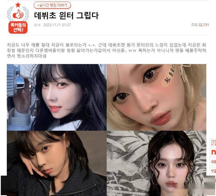 真的,以前出道初期的时候,Winter有自己独特的个性。但最近可能是因为妆容都差不多,所以整个团的成员看起来感觉都挺像的。