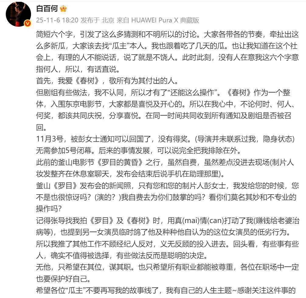 其实,白百何一开始就该澄清,发那些莫名其妙的东西,评论区里各种爆料也不删,任由外人猜测,结果反而伤害了同行,这确实不太妥当。现在《春树》的导演和制片人都没出来说话,希望他们能站出来给个解释。