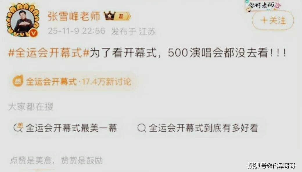 11 月 9 日,张雪峰本人微博发布动态:“全运会开幕式太燃了!可惜错过伍佰演唱会,下次一定补上”,配图为电视转播画面。但现场视频显示,同一时间段他正坐在演唱会观众席,该微博发布 1 小时后被紧急删除,删除记录被网友截图保存,“撒谎避嫌” 的质疑声迅速登顶热搜。