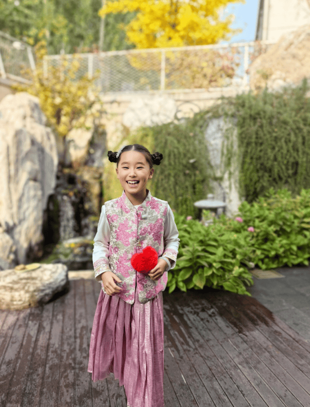 这不,张丹露就带着9岁大的小女儿luna到院子里赏秋。张丹露镜头下,luna扎着精致的哪吒头,粉色系新中式穿搭好漂亮。