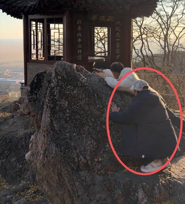 随后辛柏青还蹲下用手抱住石头,看样子也是在祈福。