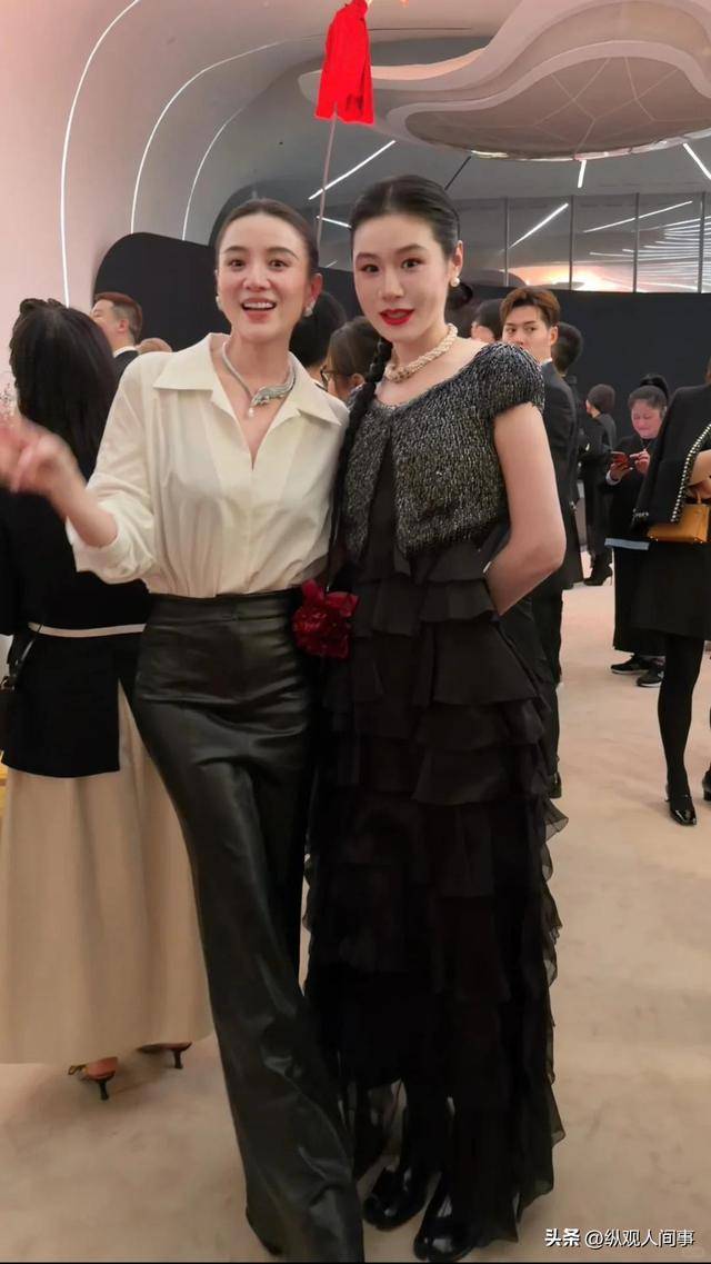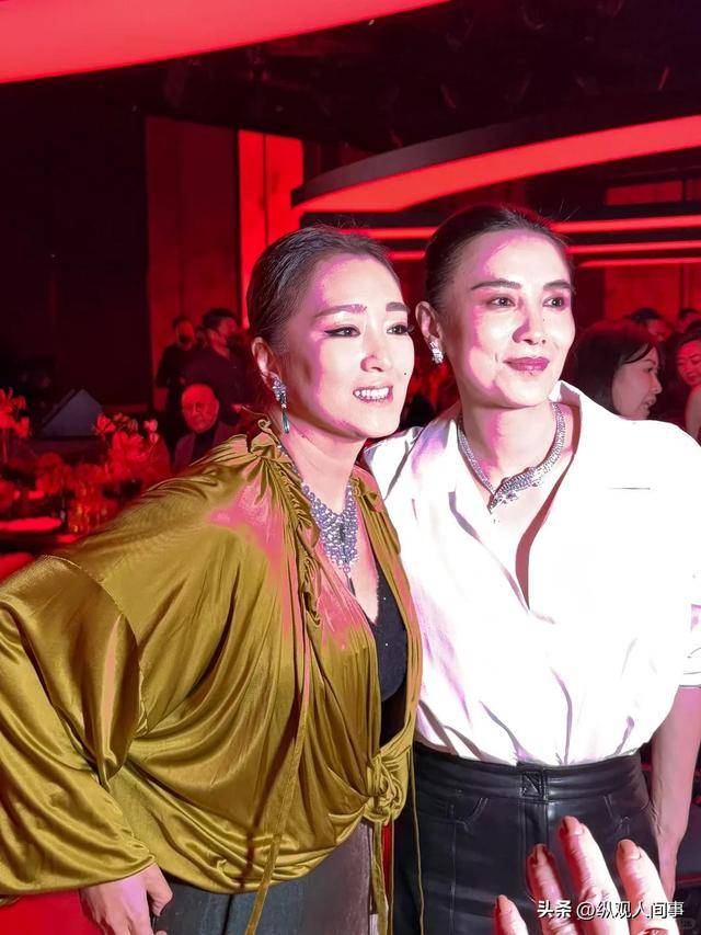 台下则一边是巩俐深V礼服配翡翠项链贵气逼人,一边是郭晶晶高领黑裙全裹出镜。