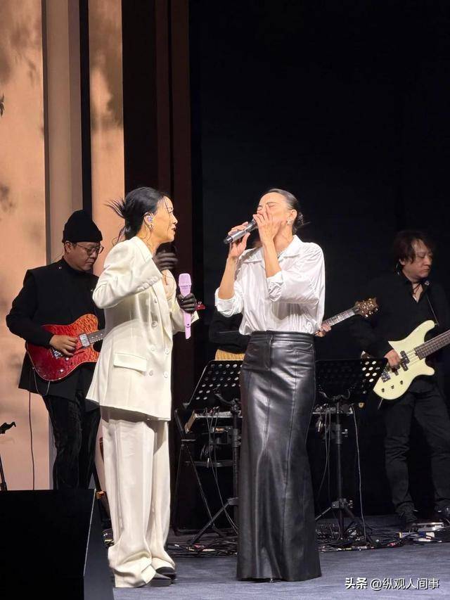 晚宴下半场,那英穿着白色西装套装突然带着乐队上台表演,演唱了《一笑而过》等好几首歌曲,瞬间吸引了全场的注意。