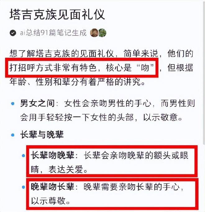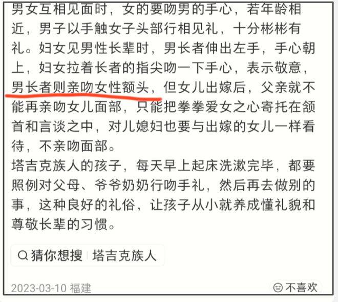 还有对当地习俗更了解的网友站出来说,塔吉克族确实有男长辈亲吻女性额头的礼仪,但有个重要前提 —— 女儿出嫁后,父亲都不能再亲吻女儿的面部了。这就说明,就算是当地习俗,也讲究分寸,女性长大后就不适合再让男长辈亲吻面部。更何况沙溢和宋雨琦只是一起录综艺的同事,既不是同族,也没有亲属关系,如果真的亲吻了面部,那确实太没边界感了。