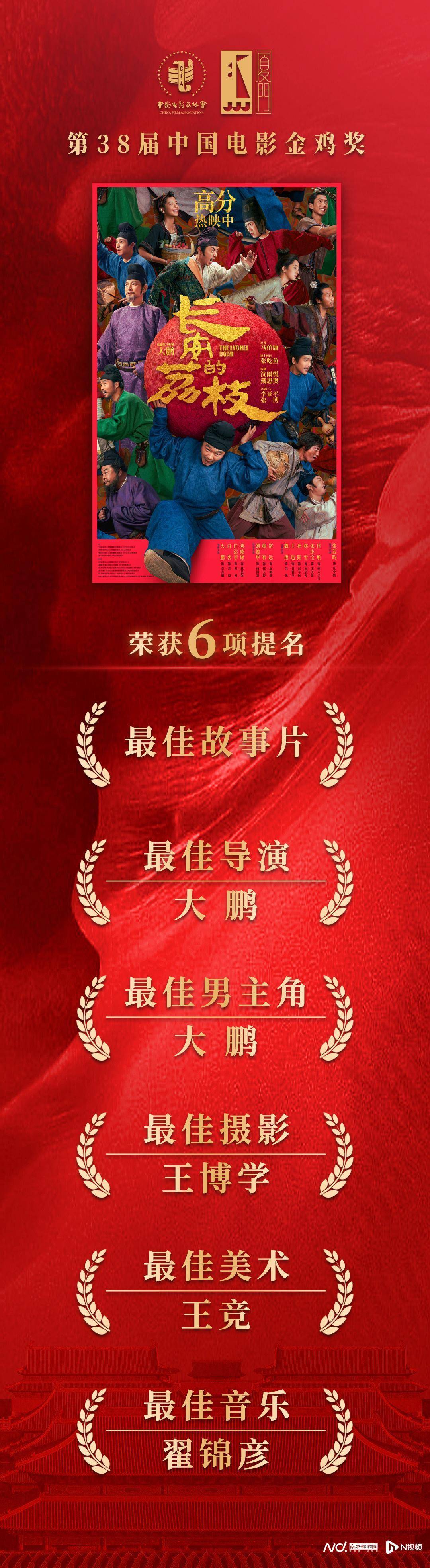 《长安的荔枝》由广东爱美影视有限公司等出品,改编自马伯庸同名小说。该片由大鹏编剧并导演,张吃鱼担任剧本顾问,沈雨悦、戴思奥担任编剧,李亚平、张博担任总制片人,大鹏、白客、庄达菲、刘俊谦领衔主演,刘德华、杨幂、常远特别出演,魏翔、王迅、孙阳、林雪、宋小宝、付航友情出演,张若昀特邀出演。在本届金鸡奖中,《长安的荔枝》总共获得6项提名,包括最佳故事片、最佳导演(大鹏)、最佳男主角(大鹏)、最佳摄影(王博学)、最佳美术(王竞)和最佳音乐(翟锦彦)。