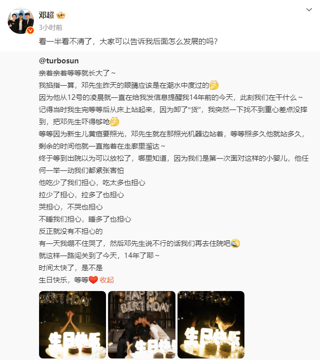 搜狐娱乐讯 13日,孙俪发长文庆祝儿子等等14岁生日,邓超看后转发回应道:“看一半看不清了,大家可以告诉我后面怎么发展的吗?”不少网友纷纷表示:“一猜就知道哭成泪人了。”