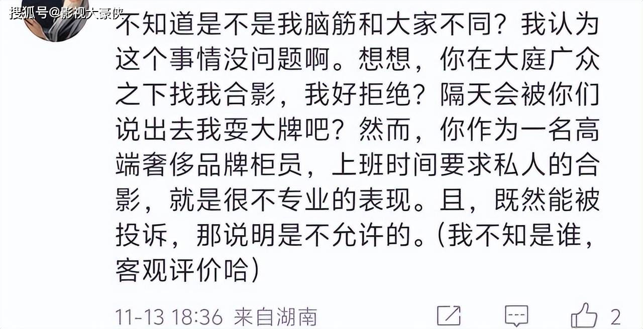 对于吃瓜群众来说,部分人觉得这种做法并没有错,本身身为柜员,在工作时间就该分清楚主次,如果明星现场拒绝合影,肯定会被说耍大牌,上班时间要求明星合照,本身就是很不专业的表演,能够被投诉,就是不被允许的事情。所以这个三字男星究竟是谁呢?