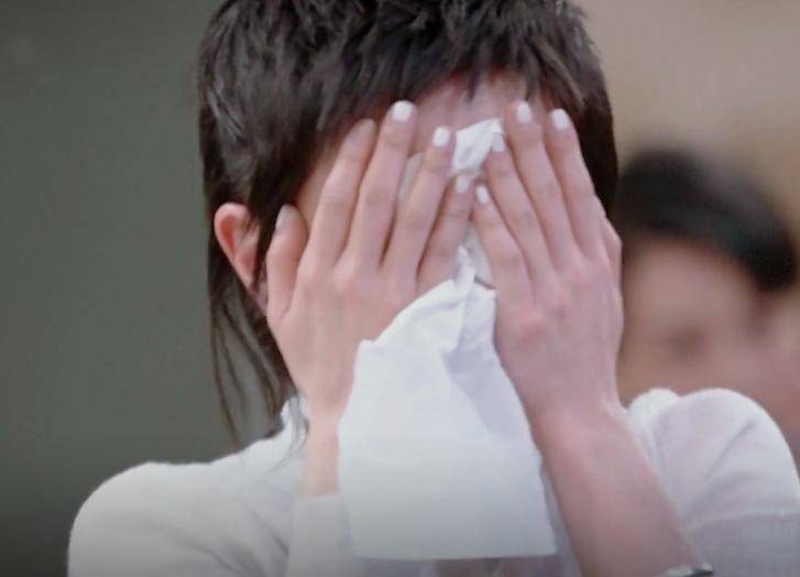 她拿纸巾擦眼泪,改用纸巾捂住嘴和鼻子,装出一副不希望被人看出自己在哭泣的假象。这番操作,果真是高人一等。