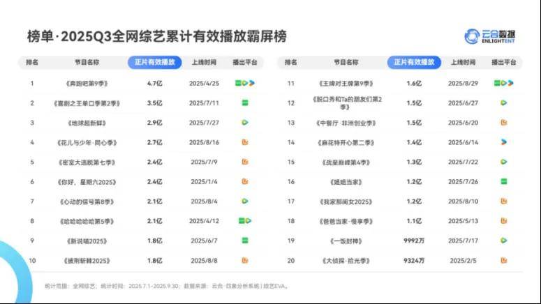 但就在其答卷不及预期的同时,综艺市场整体却呈现上升趋势。2025年Q3全网综艺top20累计有效播放39亿,同比上涨30%,全网有效播放破亿综艺18部,同比增加6部,此消彼长,略微有点尴尬。