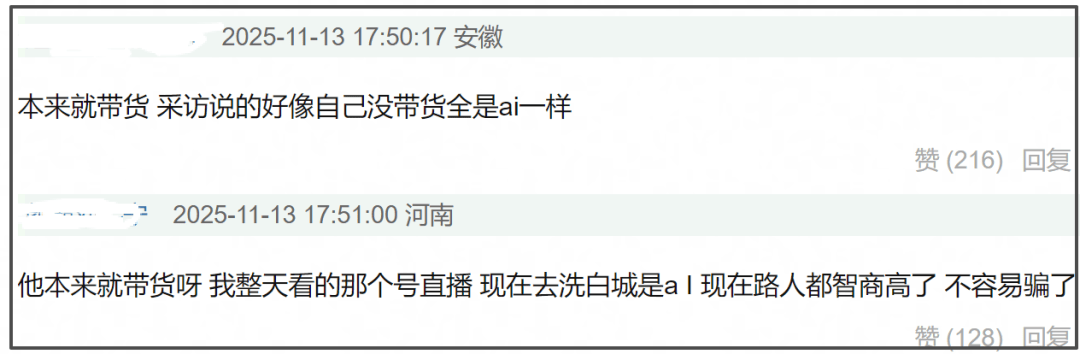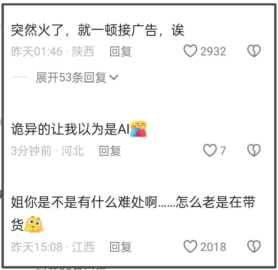 甚至,在她分享的其他内容评论区,也都是吐槽声,不是嘲讽真人像AI就是内涵她带货。