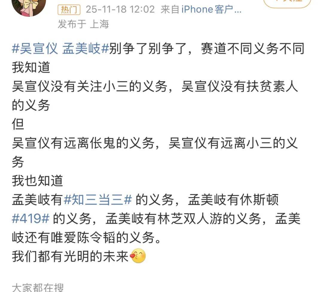 结果这个在忙的孟美岐呢,卡着吴宣仪下播的一分钟之内,专门为宋妍霏写了长文打call。