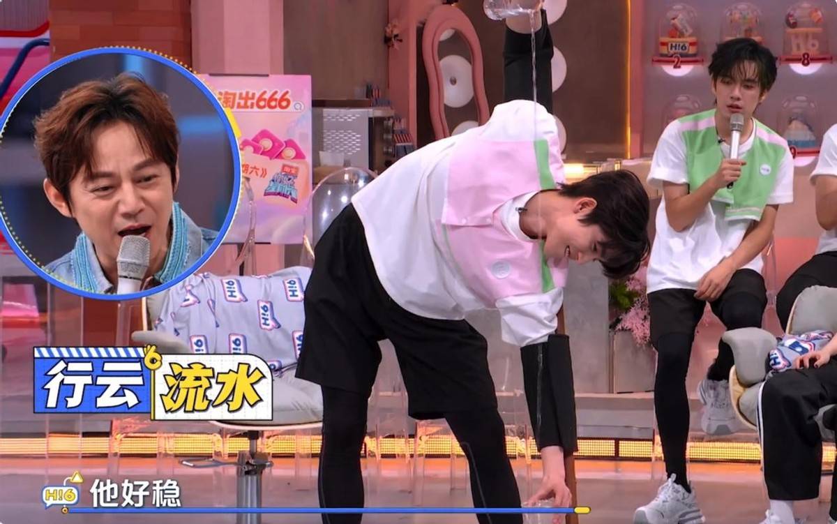 这个游戏环节堪称“奇葩游戏”和“翻车现场”的完美结合。嘉宾们需要用长棍传水,稍不小心便会引发“水花四溅”。综艺老手杨迪作为笑点担当,倒水时不小心把脸弄湿,场面既狼狈又搞笑,引得全场爆笑。而张凌赫则凭借他修长的手臂和流畅的动作稳稳地将水倒入容器,甚至没有一滴水溅出。镜头紧跟着他的每一个动作,从慢镜头到特写镜头,再到配上字幕和花字,这一段简直成了张凌赫的“魅力时刻”。他那毫不费力的优雅姿态,无疑将“帅气”与“实力”完美结合,瞬间刷足了存在感。