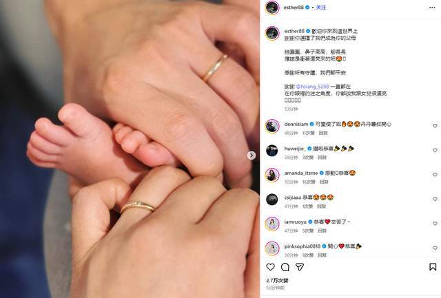 除了官宣喜讯表达心情之外,夫妻两人还特地晒出了一张温馨的画面,见的两人将婚戒套在女儿的大拇脚趾上,一人握住一只,真的太可爱了。