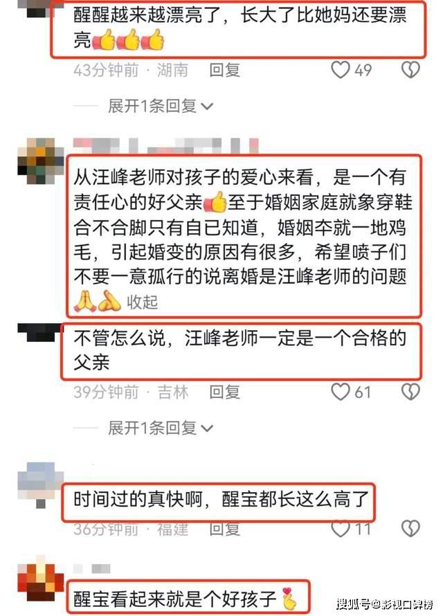 醒醒穿着粉色的运动服,扎着高马尾,很活泼,性格很开朗。小姑娘手里还拿着零食与其他同学一起分享,她与同学一边走,一边嬉戏玩闹,她们相处很融洽。爸爸汪峰一直跟在后面看着女儿,他的眼神很温柔,满满的父爱与普通的爸爸没有区别。很明显,汪峰很享受带娃的情景。