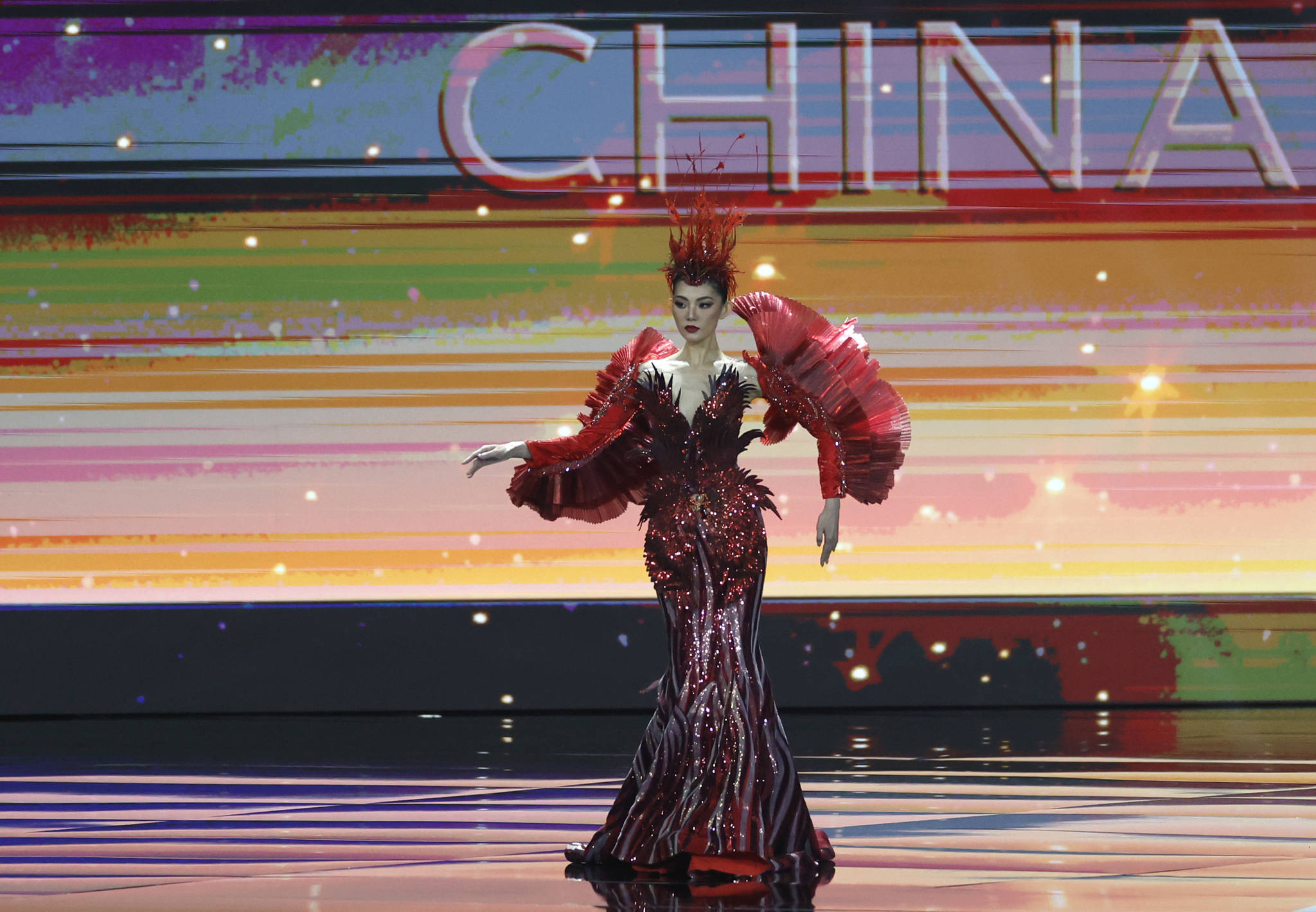 中国小姐赵娜参加2025环球小姐民族服装比赛。