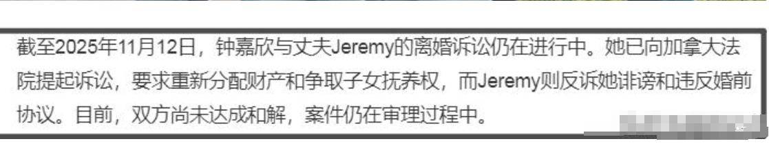根据港媒报道,钟嘉欣已经在加拿大和丈夫提出了离婚诉讼,