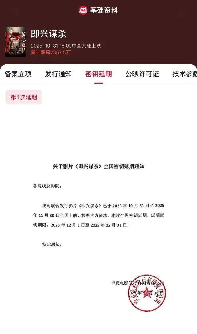 电影《即兴谋杀》将密钥延长上映至12月31日。据网络平台数据显示,截至当前,影片累计票房已超7300万。