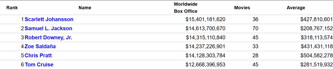 今年7月,据电影数据网站The Number的统计数据,阿汤哥成为全球票房最高的演员排行榜第6,仅次于“寡姐”斯嘉丽·约翰逊(Scarlett Johansson)、塞缪尔·L·杰克逊(Samuel L. Jackson)、小罗伯特·唐尼(Robert Downey Jr.)等经常出演漫威电影的好莱坞演员。