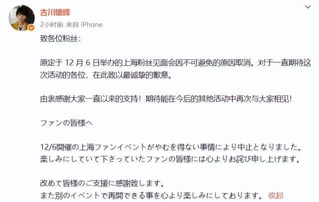 原定于12月6日举办的上海粉丝见面会因不可避免的原因取消。对于一直期待这次活动的各位,在此致以最诚挚的歉意。