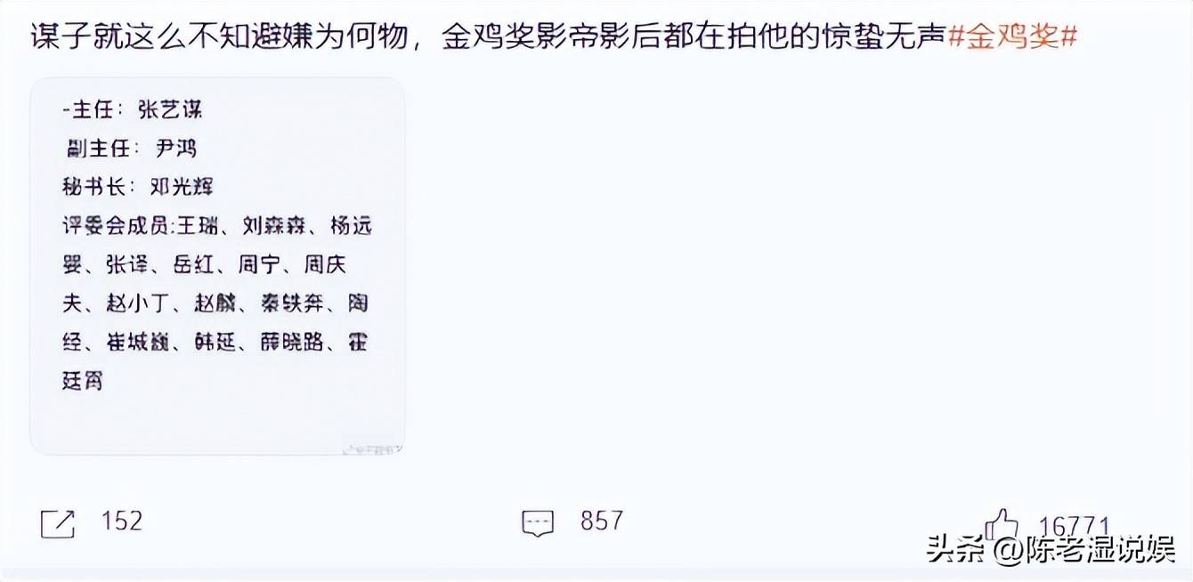 这次负责金鸡奖的主任是张艺谋,而评委会成员也是张艺谋的“老熟人”。