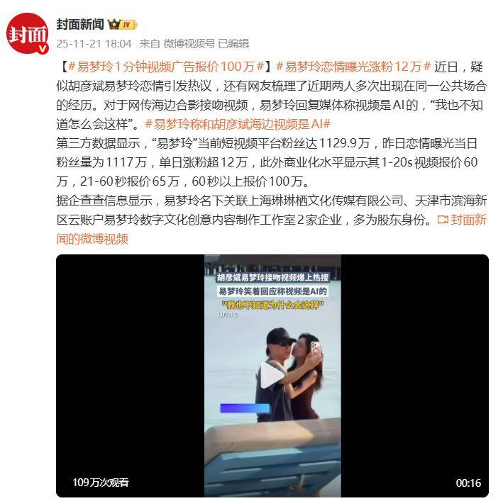 但无论真相如何,易梦玲无疑是这波流量最大的赢家。第三方数据清晰显示,在恋情曝光当日,她的短视频平台粉丝量从1117万飙升至1129.9万,单日狂揽12万新粉。更令人咋舌的是其商业价值的具象化——其短视频报价分档明确:1-20秒视频报价60万,21-60秒报价65万,60秒以上高达100万。这波话题热度,相当于白送了一条百万级别的广告。
