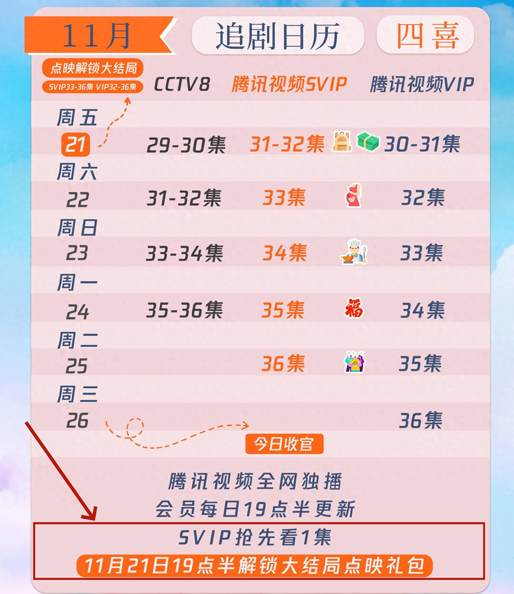 根据最新的排播安排,11月21日晚间,该剧将会跟其他剧目一样,开启超点模式,线上平台,将会一口气放出最后6集,直通最后36集大结局。