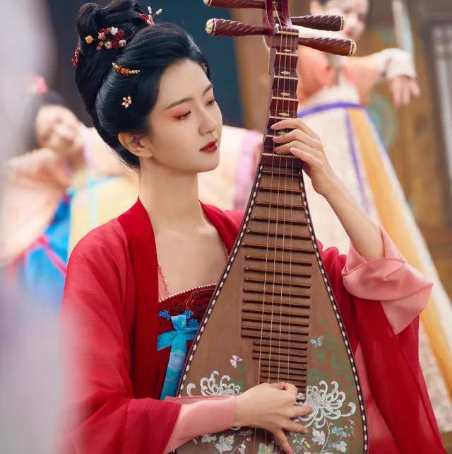 这位环球小姐出身的演员,仿佛是从盛唐画卷中走出来的美人,170cm的高挑身材搭配古典五官,一袭红衣怀抱琵琶登场时,仅凭神采飞扬、自信傲气的步态就立住了花魁气场。