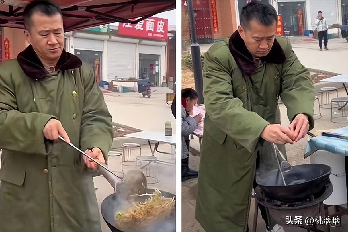 穿着绿色军大衣,熟练地颠勺翻面,细问之下才知道原来是因为无戏可拍不得已这么做。