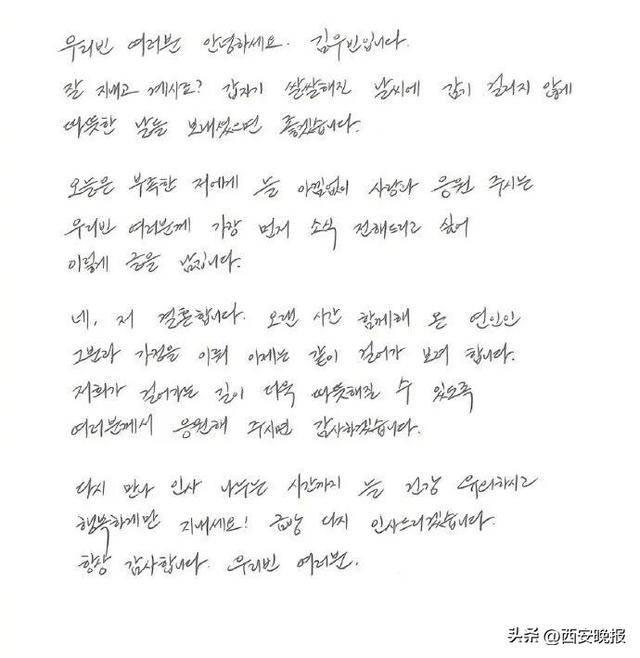 11月20日,据荆楚网,韩国男星金宇彬发手写信官宣与申敏儿结婚。信中写道:“对,我要结婚了,和长时间以来一起的那位恋人,准备组成家庭一直走下去了。”