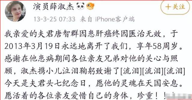 那年3月,薛淑杰通过社交媒体公布了丈夫唐智群因肝癌去世的消息,享年58岁,当时57岁的薛淑杰,瞬间失去了人生的港湾。