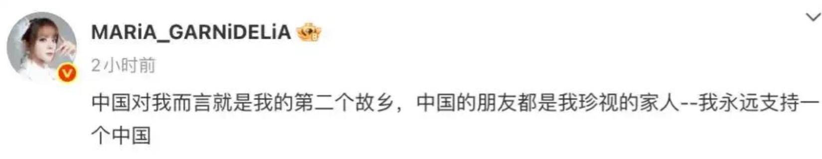 歌手美依礼芽也在社交平台发声:“中国是我的第二个故乡,我永远支持一个中国。”