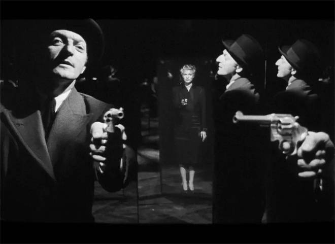 赵又廷在一个布满了镜面的空间中持枪找寻易烊千玺,也在其中迷失了方向。这场镜子迷宫戏的致敬来源可以追溯至1947年由执导的经典黑色电影。