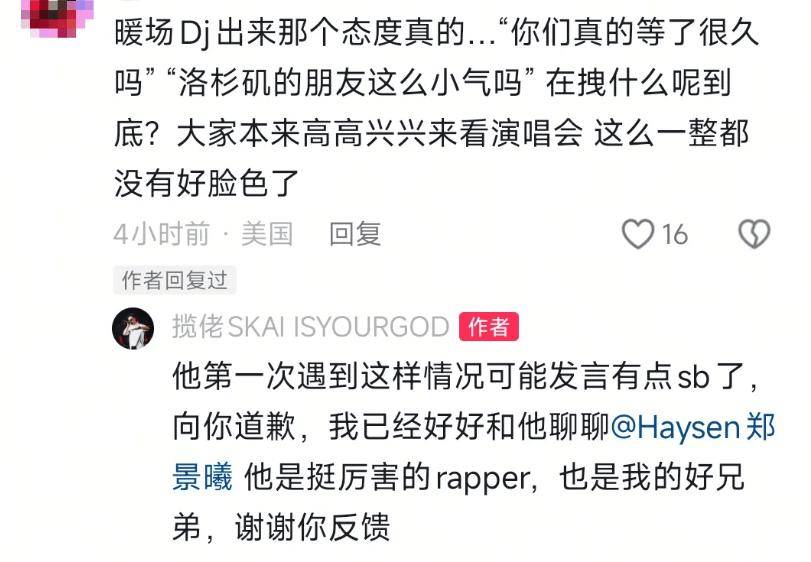“洛杉矶的朋友们,看到你们的评论了,当时我在台上第一次遇到这种情况,我也没做好准备,说话着急了。”