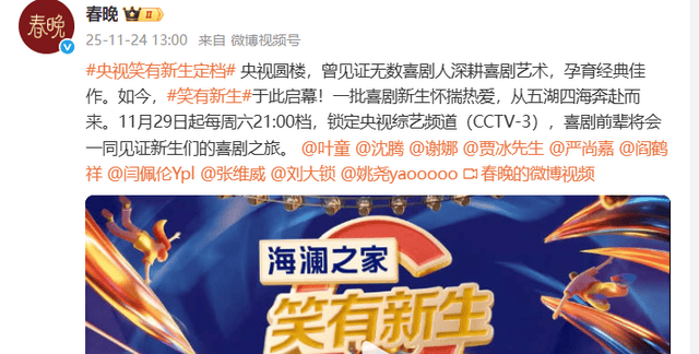 2025年11月24号下午13:00,中央广播电视总台春晚发布消息: