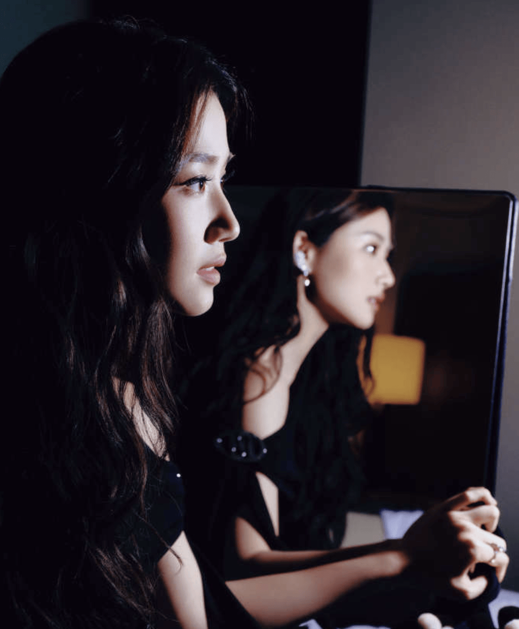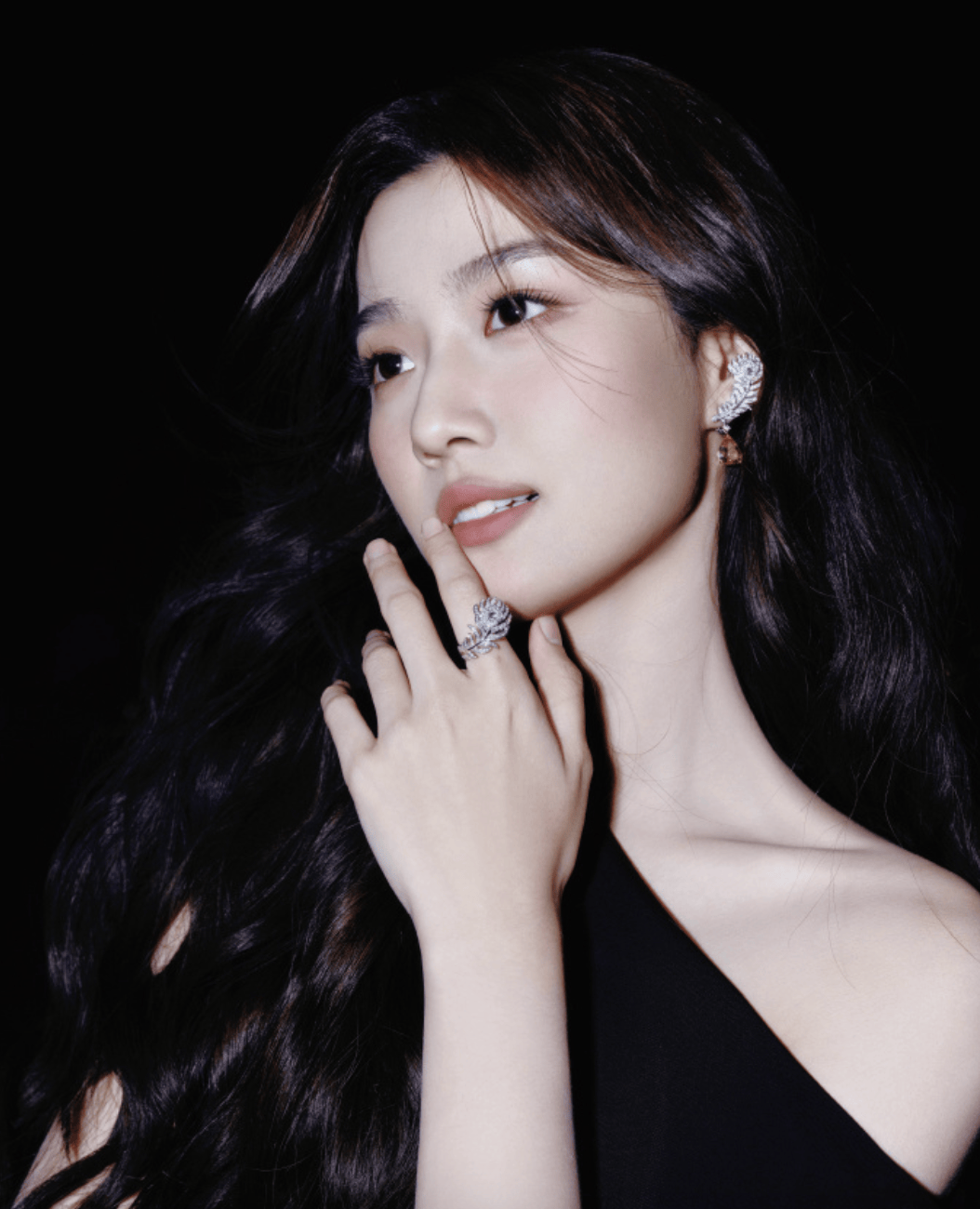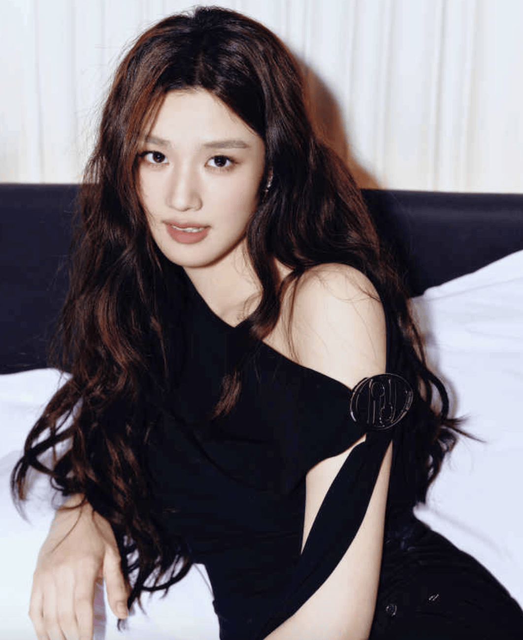 卢昱晓长发如瀑垂落肩头,黑色露肩装勾勒出优雅曲线。