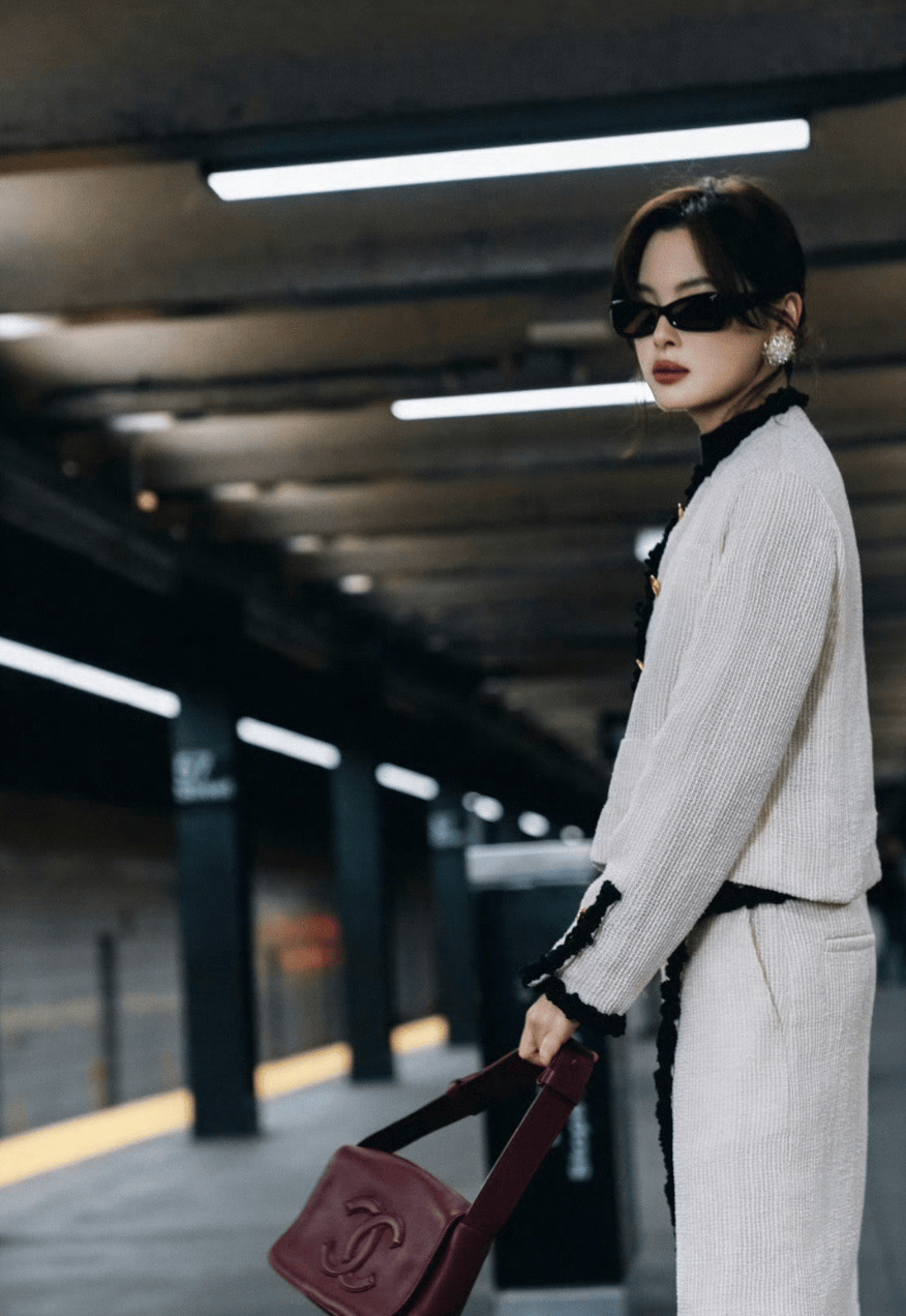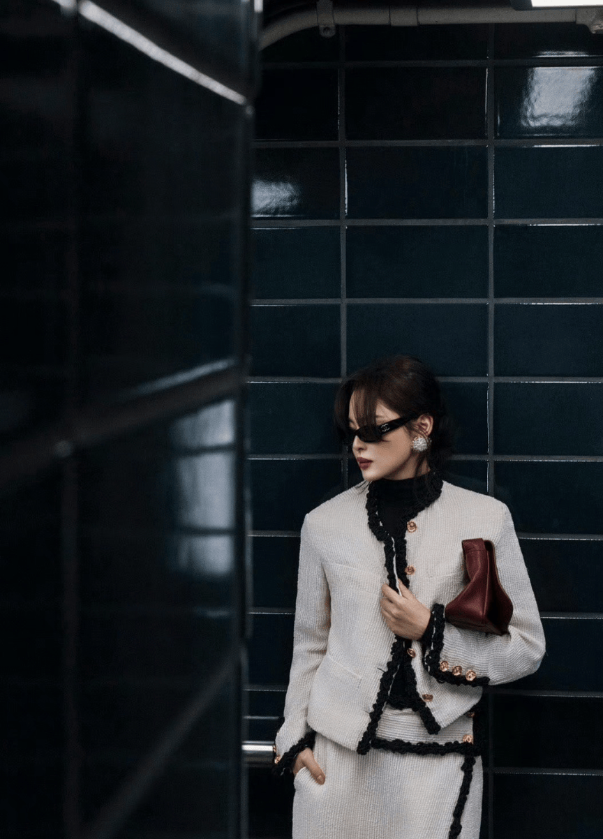 辛芷蕾白色套装的利落线条与酒红包的明艳相融,冷感氛围拉满。