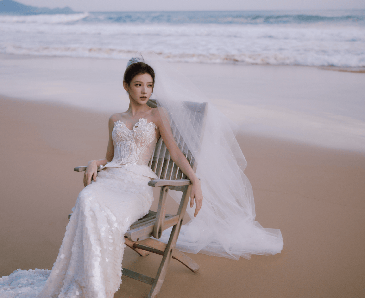 张予曦倚坐木椅,白纱造型简约精致。