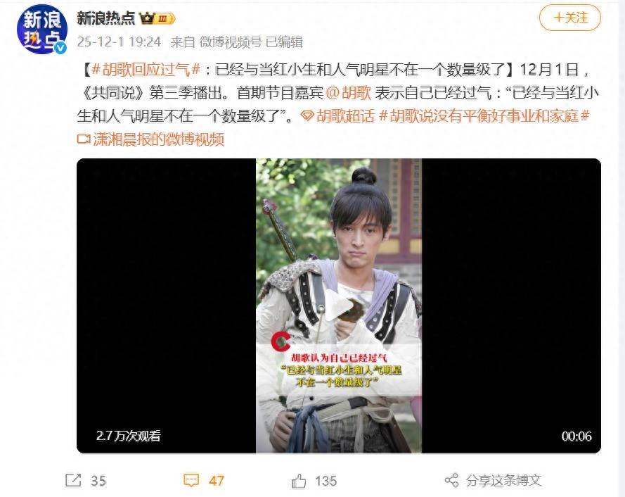 总而言之,胡歌这场关于“过气”的坦诚,看似是明星对人气起伏的感慨,实则揭开了一层行业真相:在娱乐圈这个名利场,有人追逐流量的潮头,有人选择深耕价值的深海。当“红”的定义被无限窄化为瞬时数据,胡歌们用作品和奖项重新划定了“影响力”的坐标。这场对话,与其说是过气演员的自嘲,不如说是一位成熟从业者对行业浮躁病的温和提醒——真正的“维度”,从来不在热搜榜上。