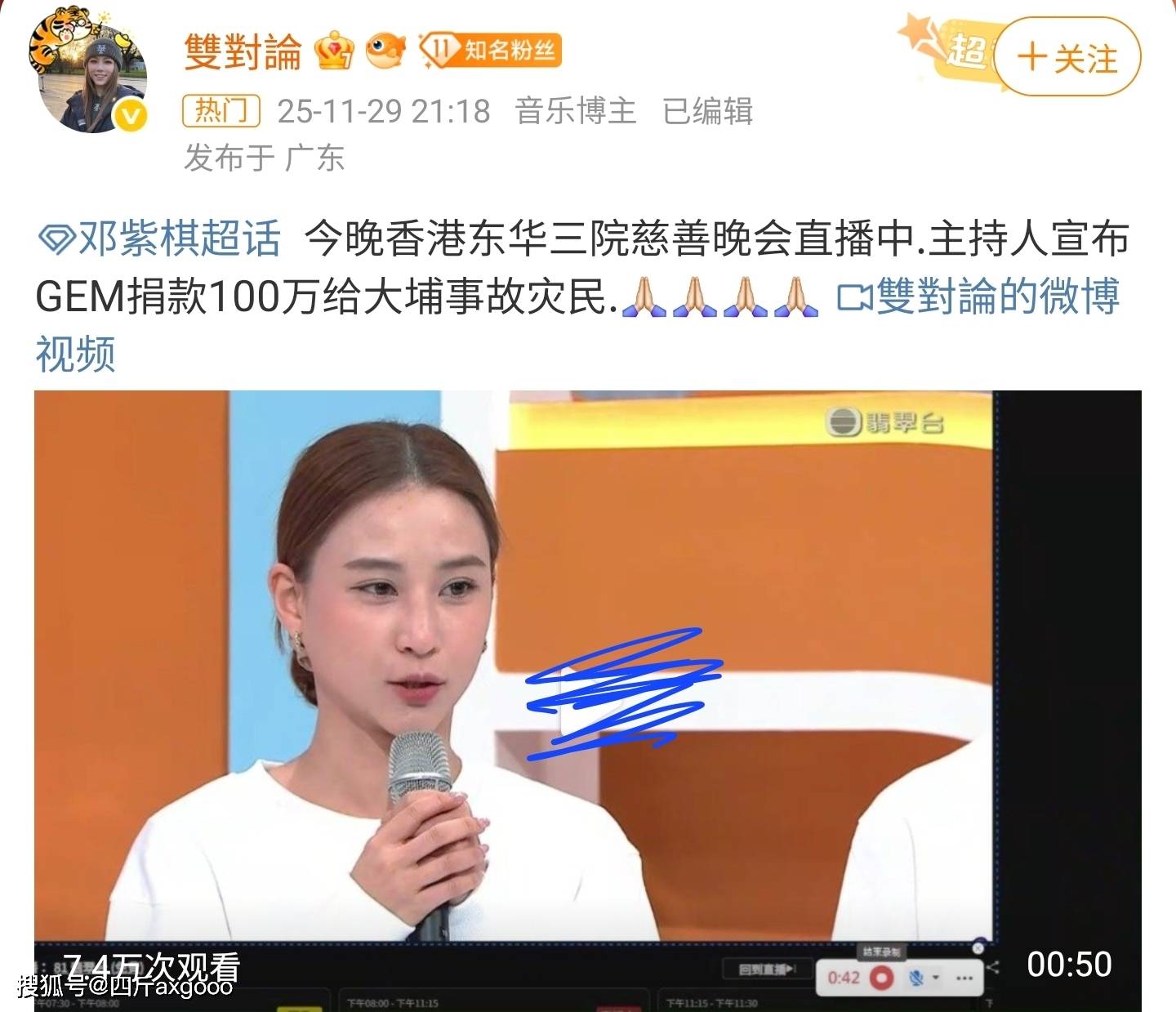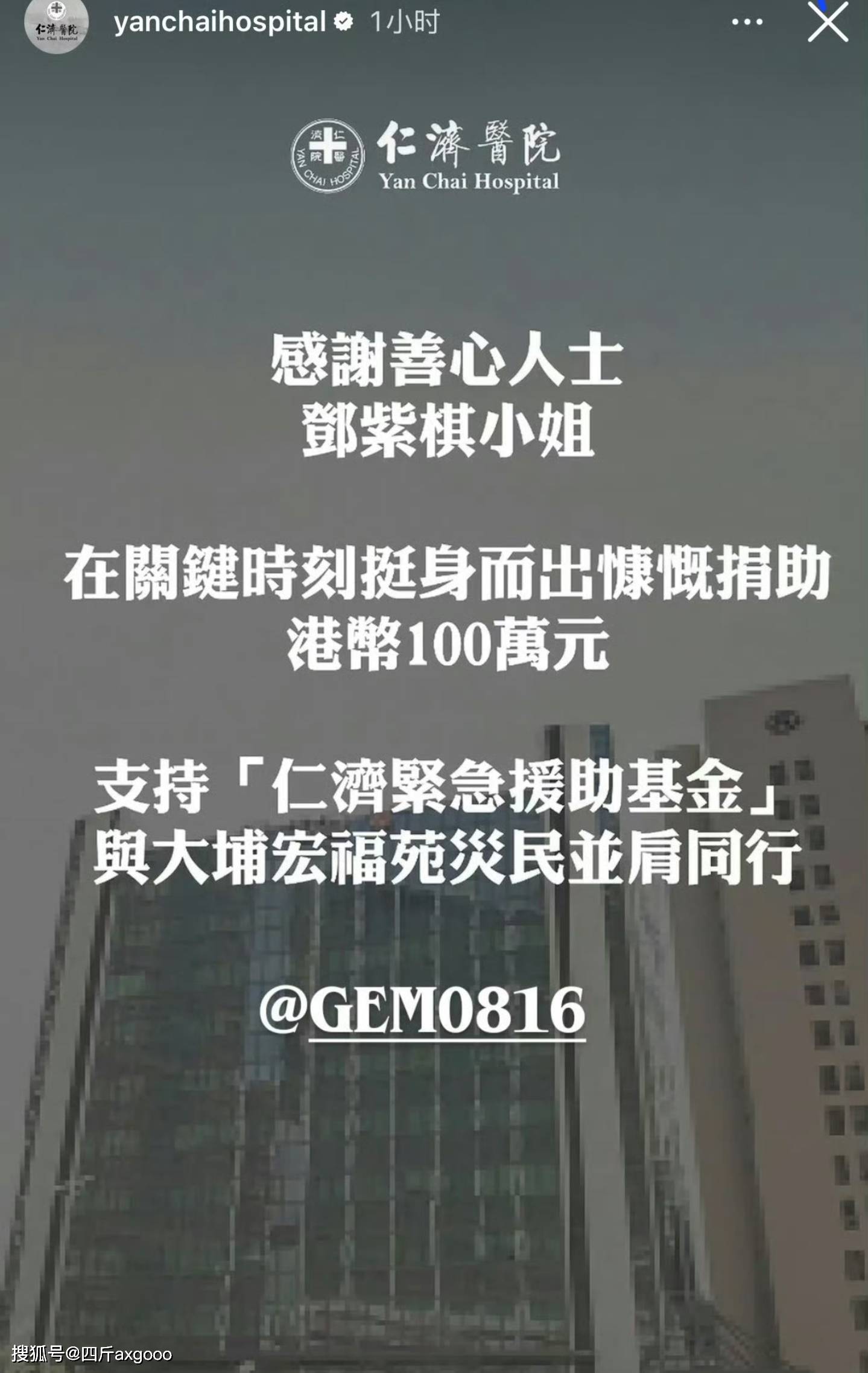后面香港东华三院慈善晚会主持人透露邓紫棋向大埔灾民捐赠100万港元。