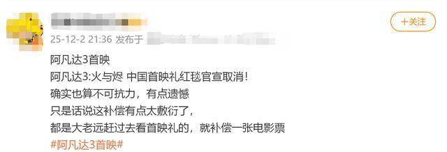 可惜12月1日三亚还在宣传电影首映礼,结果12月2日就传出《阿凡达3》内地首映礼红毯取消的消息,给出的理由也很模糊,声称是因为“不可抗力”。
