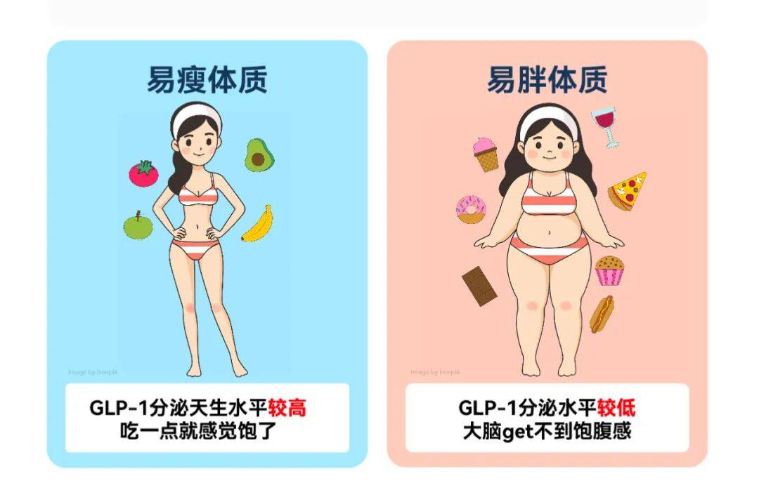 有一部分人天生GLP-1分泌水平偏低,大脑接收不到清晰的饱腹信号,自然容易吃多,也就是所谓的“易胖体质”。