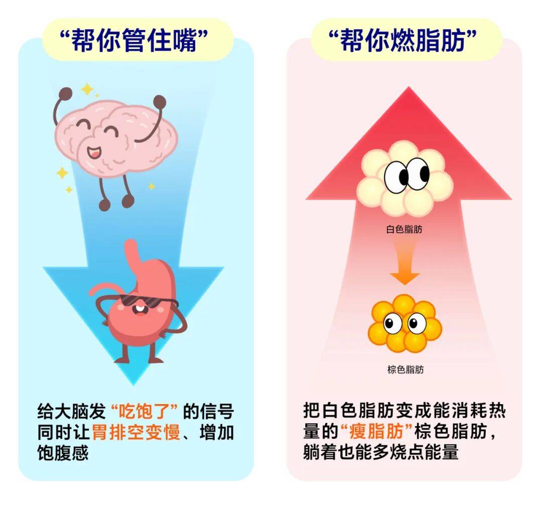 ✨帮你燃脂肪:肚子、大腿上那些难减的肉,大多是不容易燃烧的白色脂肪。而GLP-1能帮忙让这些白色脂肪,慢慢变成容易燃烧的棕色脂肪,减重更省心。