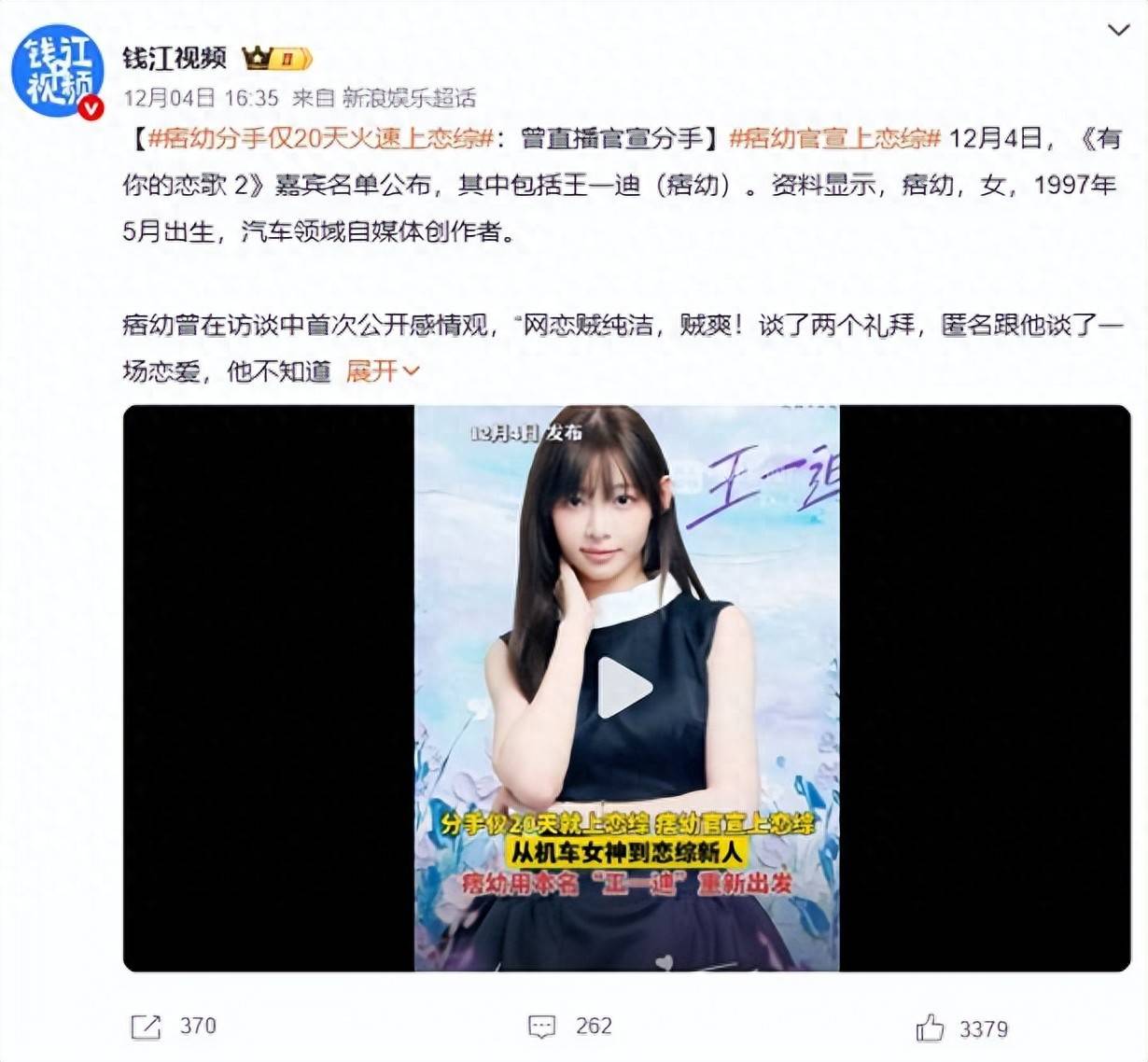 12月4日,恋爱综艺《有你的恋歌2》官宣新一季嘉宾名单,拥有千万粉丝的汽车领域网红王一迪(痞幼)赫然在列。资料显示,这位1997年出生的“机车女神”将转型恋综嘉宾,寻求屏幕上的浪漫可能。然而,消息引发的并非全是祝福,更多是围绕时间线的错愕与质疑——仅仅在20天前的11月14日,痞幼刚在直播中宣布与高中同学男友“小袁”因“未来规划不合”和平分手,并承诺回归朋友关系。如此紧凑的节奏,让“无缝衔接”的争议迅速冲上风口,不少网友直指其“剧本感过重”,质疑恋综是否已沦为“网红跳板”或“过气艺人收容所”。
