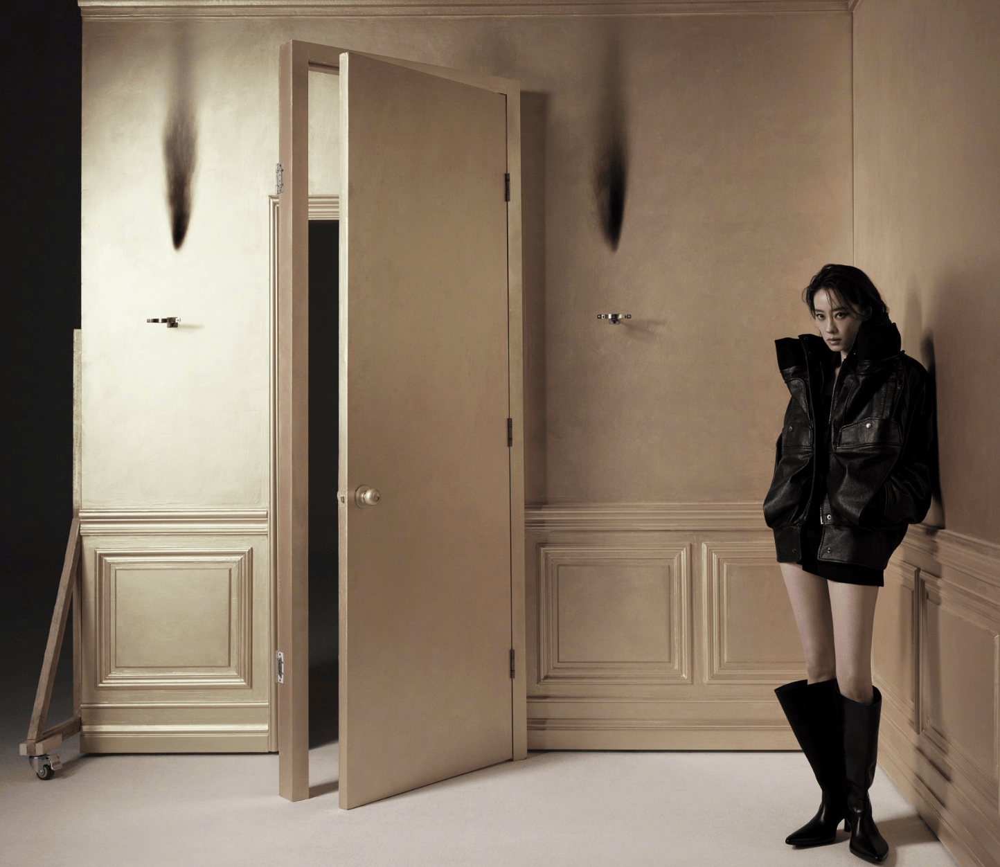 张小斐身着灰调粗花呢套装,单手搭在门框上。