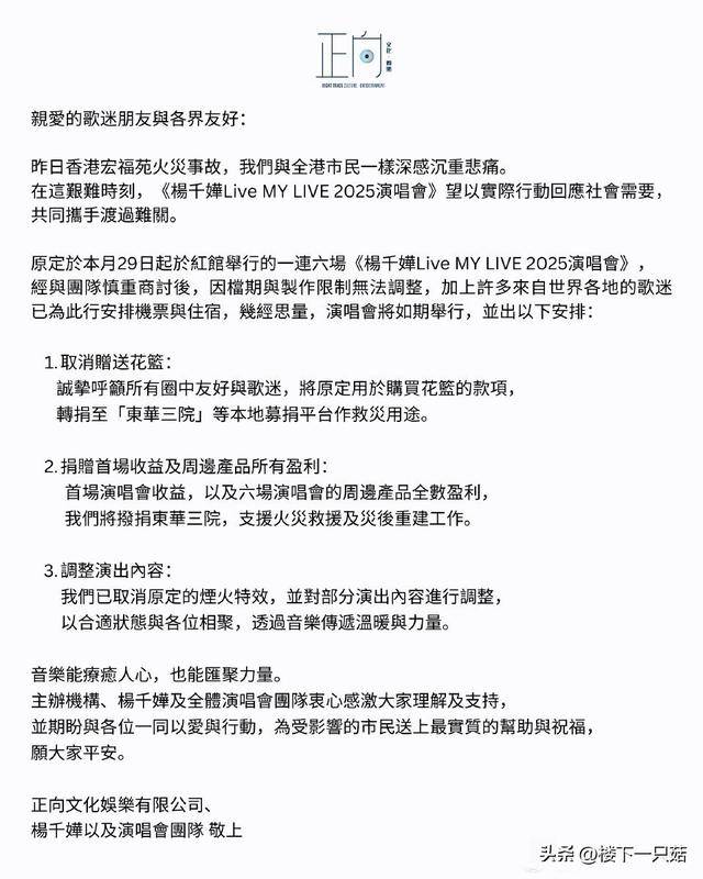 香港宏福苑大火一直牵动着大家的心,社会各界人士也在尽自己所能提供帮助。其中歌手杨千嬅原定于29日举办的出道30周年演唱会按时举办,杨千嬅的两个举动让她口碑暴涨。