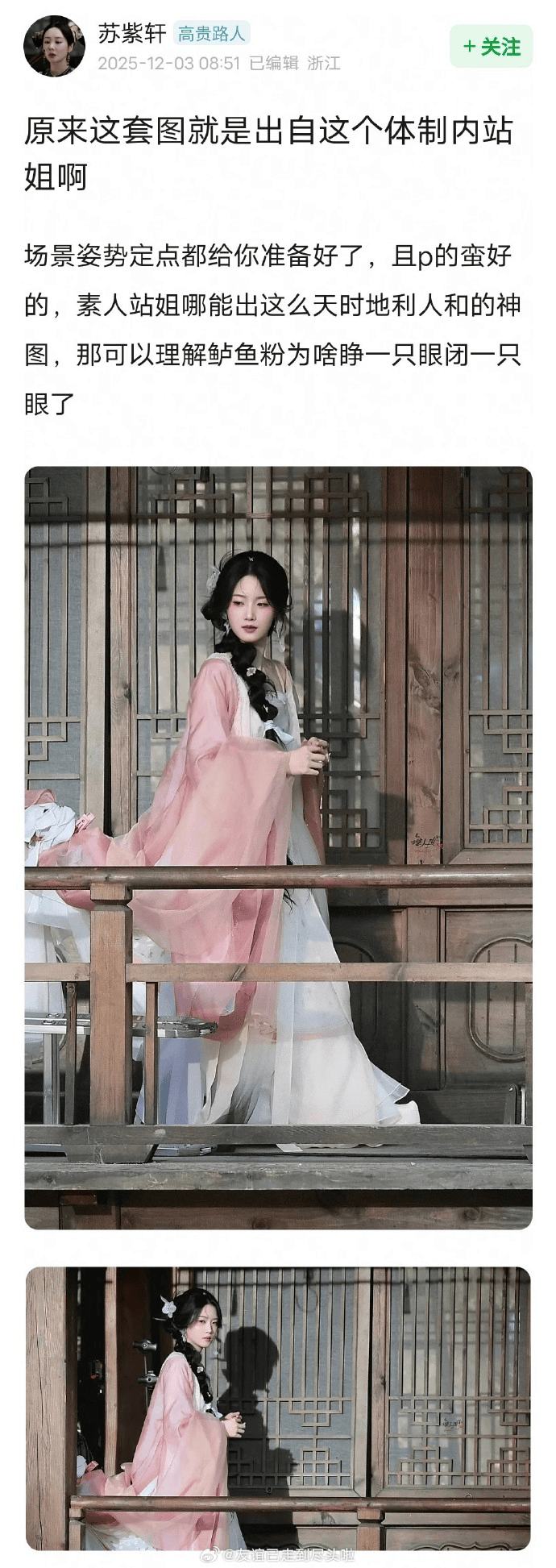 单纯是职业粉丝的话倒也还好,有人戏称她是“体制内站姐”,场景姿势定点都准备好了,还包p图的,她能出素人站姐出不了的“具备天时地利人和”的神图,那不论工作室还是其他粉丝,多少都会睁一只眼闭一只眼。