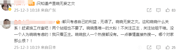 别家粉丝觉得冤枉很正常,卢昱晓粉丝的逻辑是,危险世界、无人及你、工作室,三个群体都没有为卢昱晓着想,他们只考虑自己的利益,卢昱晓应该赶紧换工作室,两个站姐也都别要了,自己给自己当大粉就挺好。
