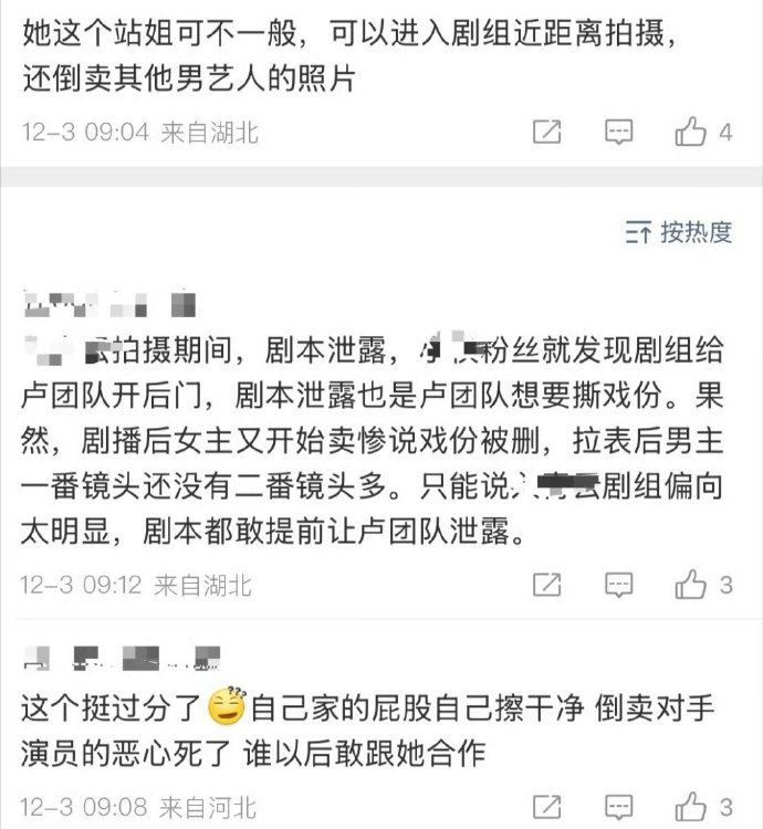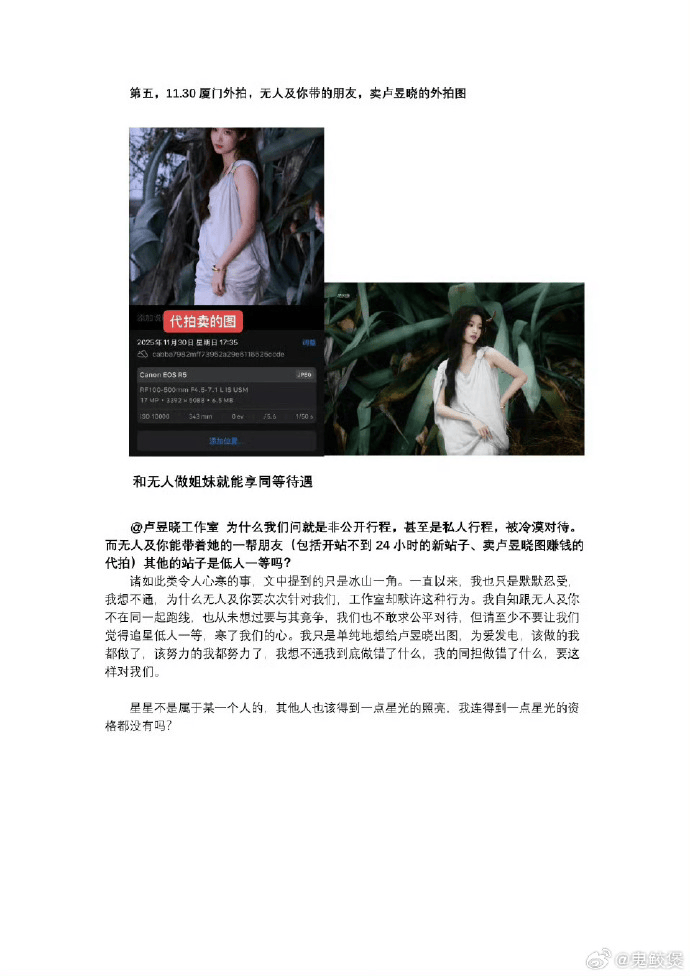有一小撮粉丝选择脱粉,他们认为卢昱晓肯定知情,毕竟好多照片拍摄视角离她很近,她跟镜头也有眼神互动,对面是不是自己的工作人员,她看一眼就清楚,这些图最后都发到哪里了,她上网也能看到。
