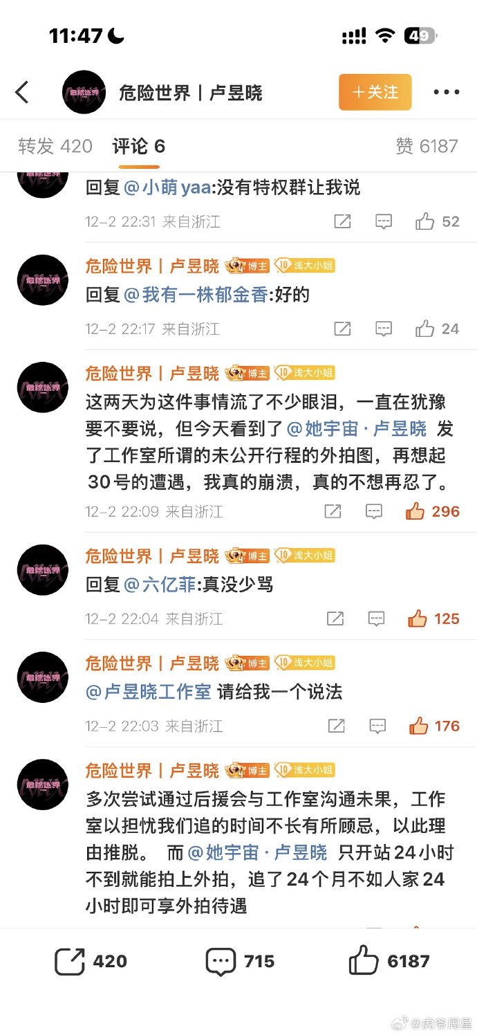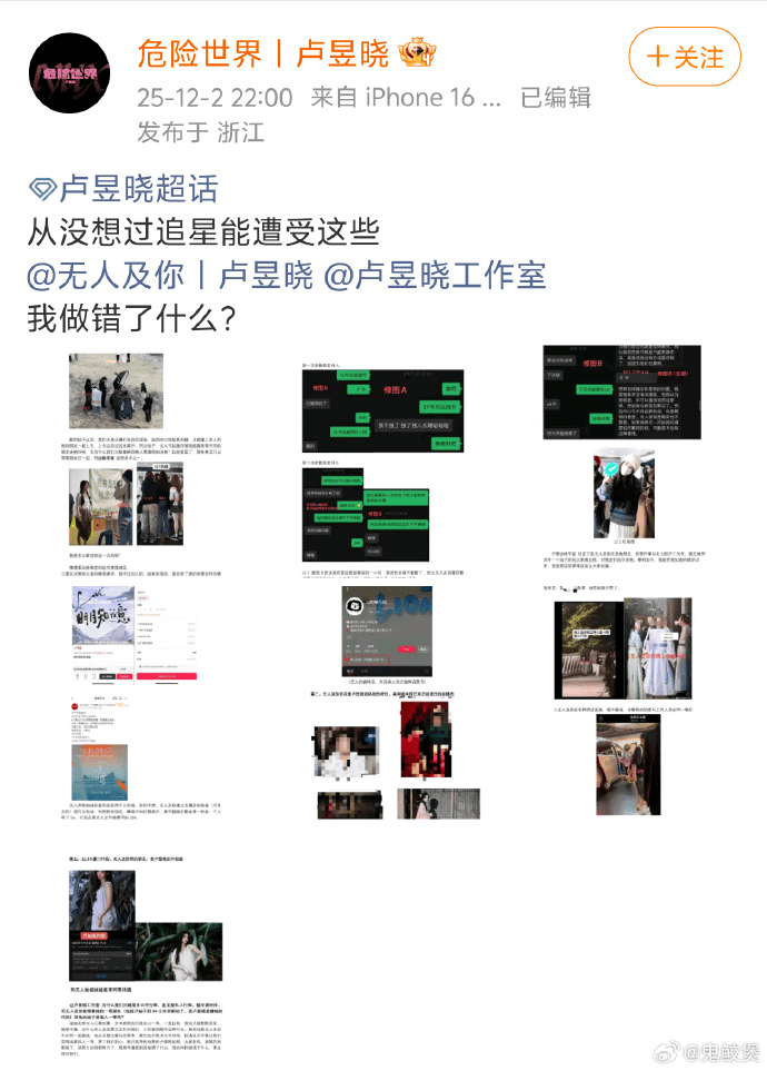 先给没吃上这瓜的朋友讲讲到底发生了什么,前两天卢昱晓站姐“危险世界”发了千字长文,控诉工作室和另一位站姐“无人及你”私联,“从没想过追星能遭遇这些,我做错了什么”。
